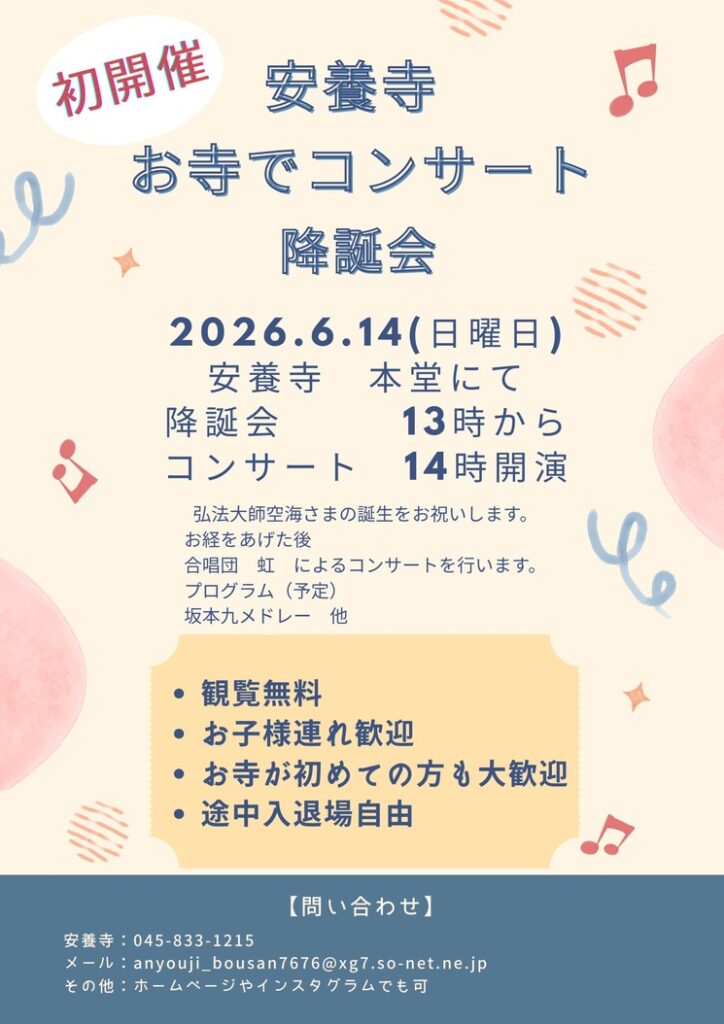 なお、コンサートの前には弘法大師空海の誕生日をお祝いする降誕会の法要も厳修いたします。