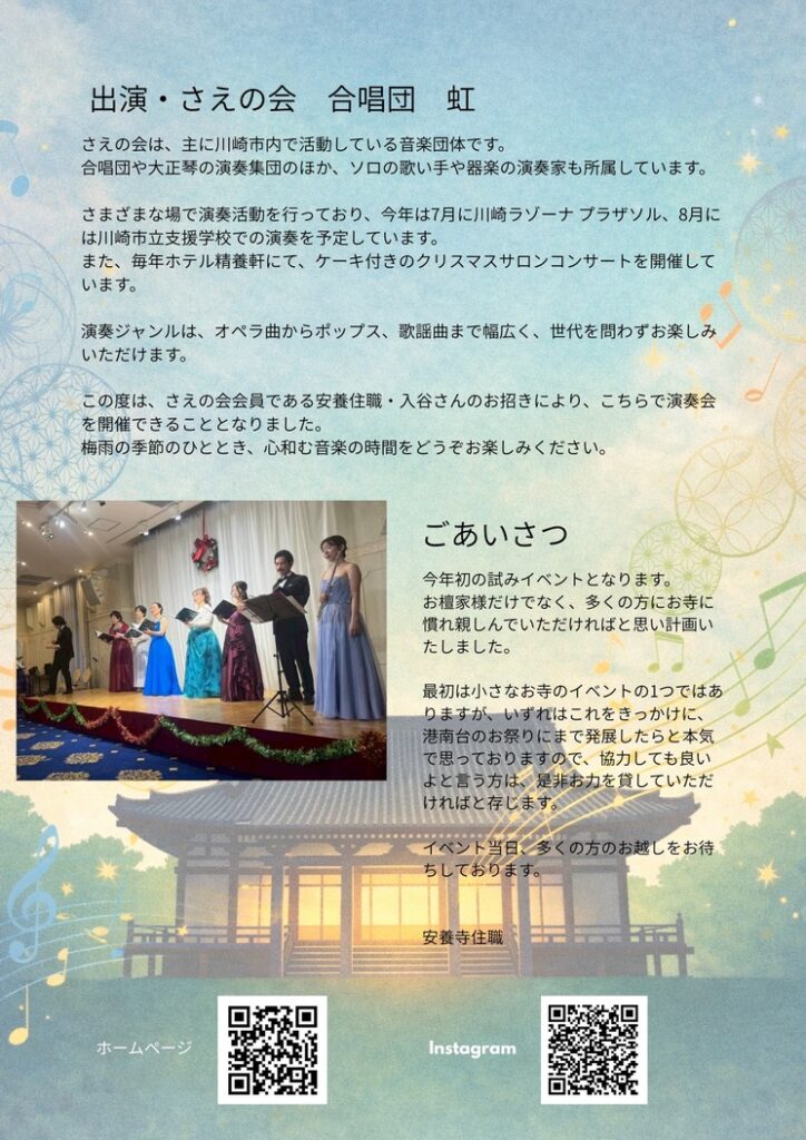 合唱団の皆さまをお招きし、美しい歌声を本堂に響かせていただきます。